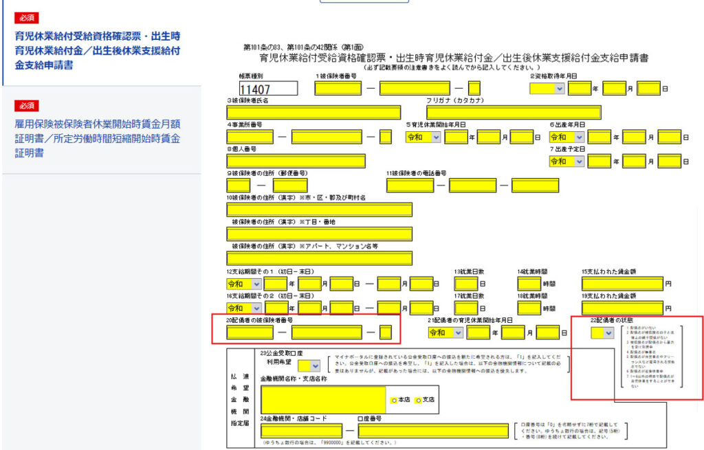 上記のとおり配偶者の被保険者番号を本人から提出されるのを待っていた、というのも今となってはおかしな話なのですが、働いている女性であってもお子様が出生後すぐに育児休業に入るわけではなく、8週の産後休業がありますから、男性側からすれば、妻が育児休業に入ってからその給付金の通知書で雇用保険番号を確認して、男性の出生後休業支援給付申請をしていたらちょっと遅いわけです。厚労省リーフレットの支給要件1-②にも、『子の出生日の翌日において「配偶者の育児休業を要件としない場合」(裏面の3参照)』とありますので、パートナーの産後休業中はこちらの㉒の項目を「配偶者が産後休業中」と記載して申請すれば、出生後休業支援給付金は支給されます。同様に何らかの理由で雇用保険番号が無くとも、それ以外の要件を選択できるようになっています。男性給付金申請のときはこちらを選択されるのがよいでしょう。